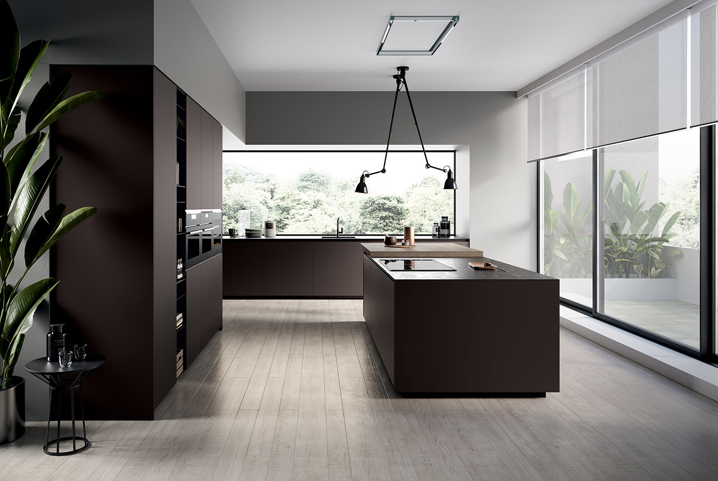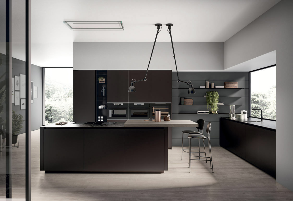 La semplicità delle forme della cucina Glass 2.0 è smorzata dalle finiture in vetro opaco, che arricchiscono ogni pensile, colonna e base. Gli elementi in vetro si inseriscono perfettamente in contesti abitativi in stile moderno o classico. Le ante sono prive di maniglie, per uno stile sobrio ed elegante, dove primeggiano gli elementi materici e le forme squadrate. Le basi della cucina e le colonne inserite tra i pensili sono ricoperte con vetri opachi color caffè, per un perfetto contrasto con l’acciaio e il legno degli altri elementi.