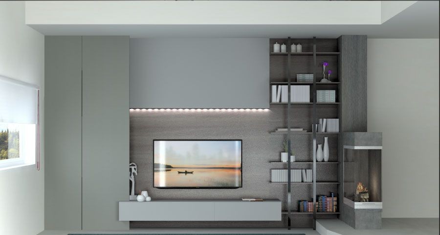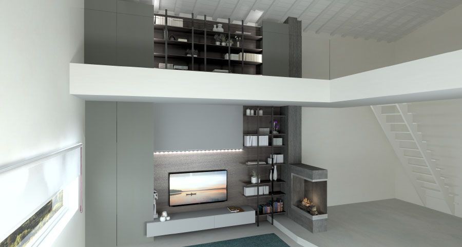 Studiare una soluzione d’arredo che potesse coprire a tutta altezza la parete TV, per permettere a chi è seduto sul divano di fronte di poter godere di una vista lineare, univoca, che dia continuità tra i due piani.
