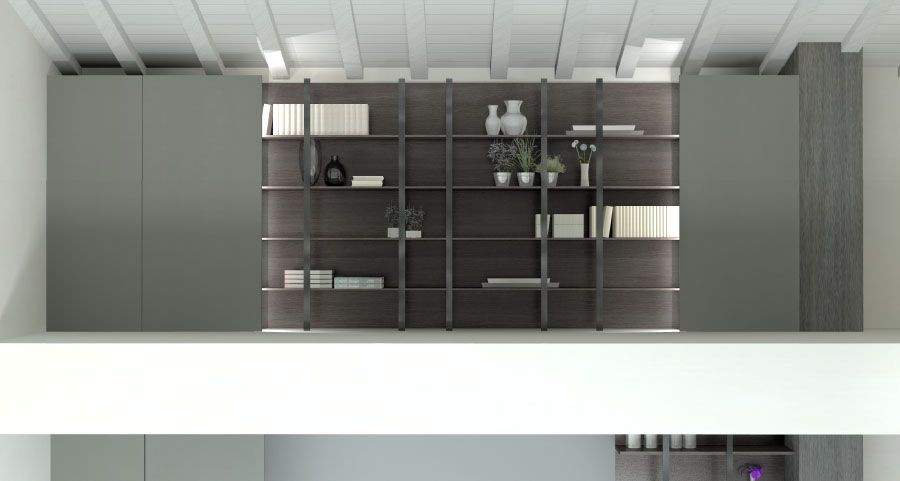Una parete attrezzata firmata Modulnova, composta da vani contenitori e librerie, a tutta altezza, in grado di riempire tutta la parete; gli scaffali della libreria, con le loro linee geometriche e con la loro leggerezza, non appesantiscono la parete, anzi: creano un piacevole movimento e gioco di linee che rende fluida la realizzazione.